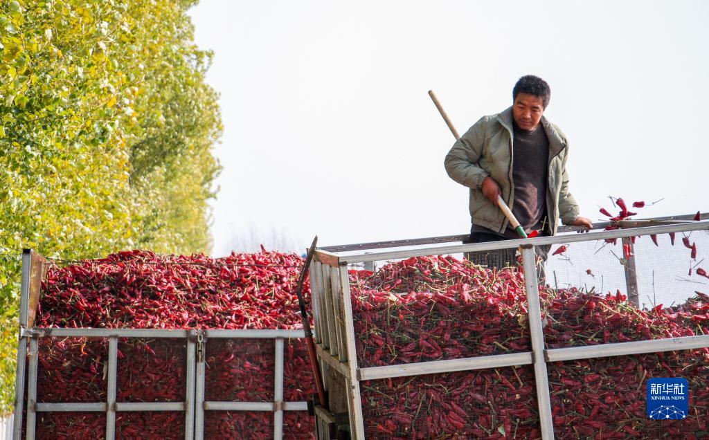 10月25日,在開(kāi)魯縣東風(fēng)鎮東方紅村,村民收獲紅干椒。