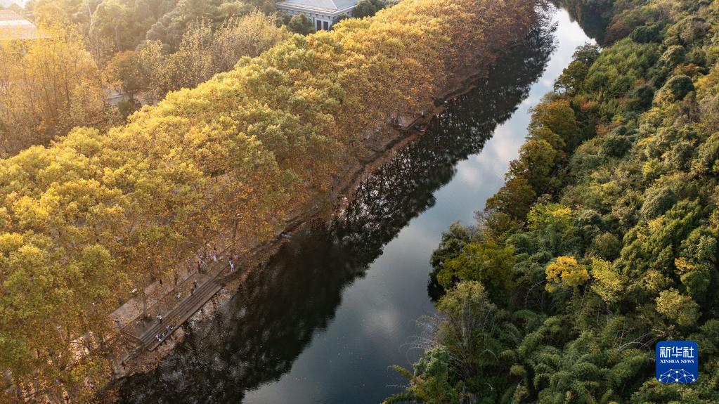這是貴陽(yáng)市花溪國家城市濕地公園黃金大道風(fēng)景(10月25日攝,無(wú)人機照片)。