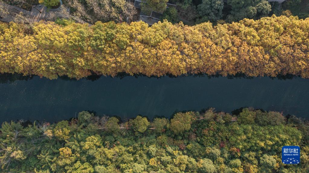 這是貴陽(yáng)市花溪國家城市濕地公園黃金大道風(fēng)景(10月25日攝,無(wú)人機照片)。