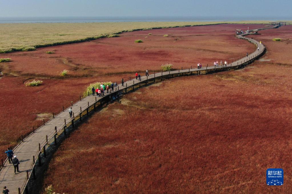 游客在盤(pán)錦市紅海灘國家風(fēng)景廊道景區游玩(2022年9月28日攝,無(wú)人機照片)。