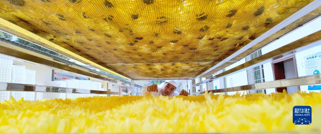10月26日,岳林村皇菊種植基地員工整理烘干架上的菊花。