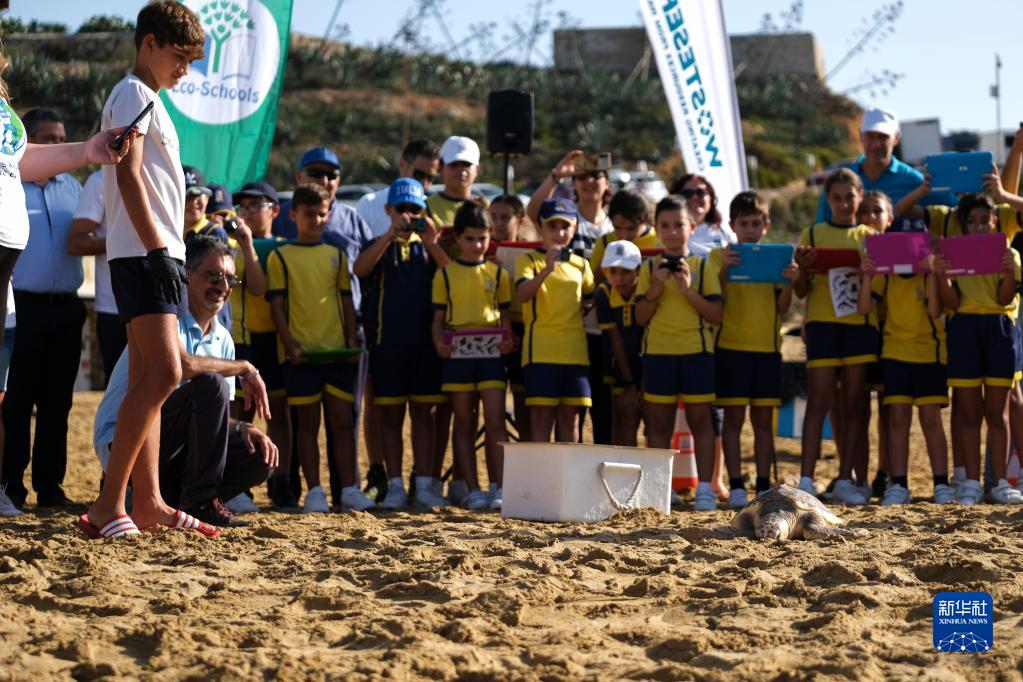 10月27日,在馬耳他馬尼卡塔的金海灣,一只經(jīng)過(guò)救治后康復的海龜被放歸大海。