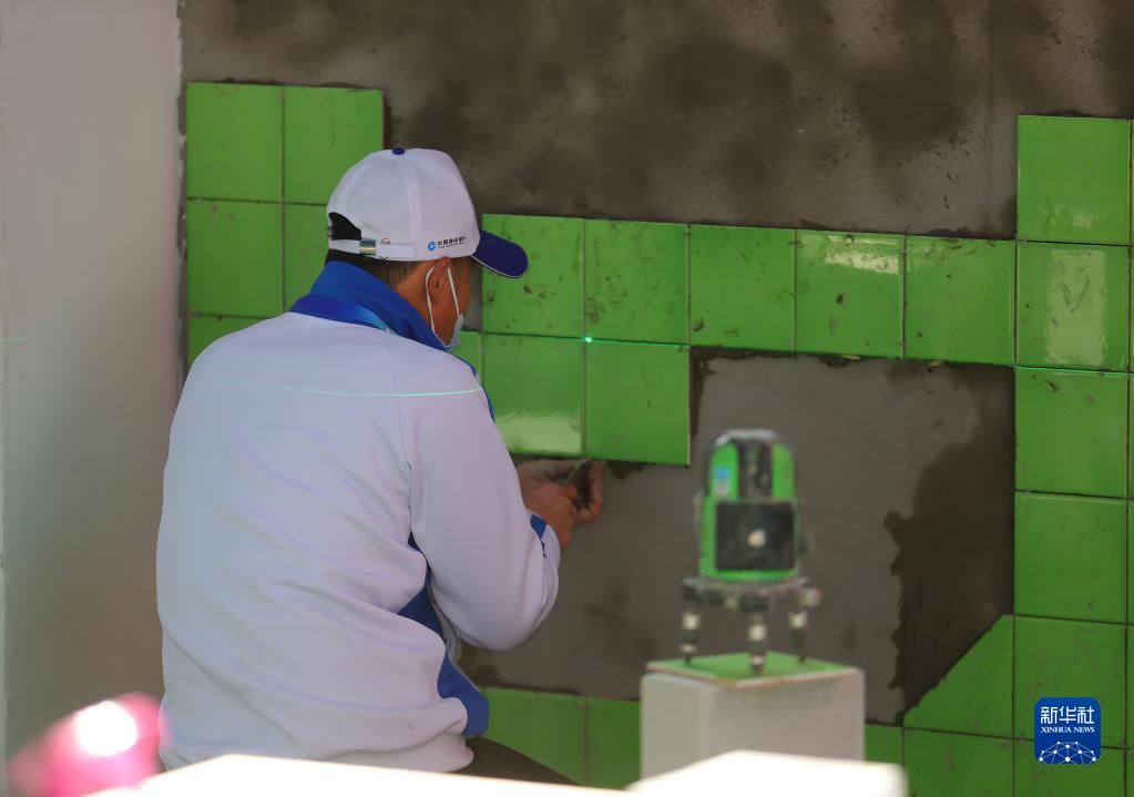 10月27日,參賽選手參加瓷磚貼面項目比賽。
