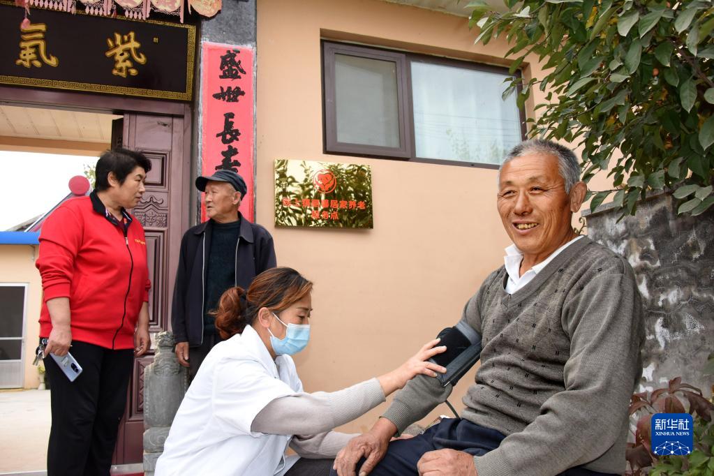 10月26日,在青島萊西市院上鎮武備三村居家養老服務(wù)站,工作人員為老人提供健康監測服務(wù)。