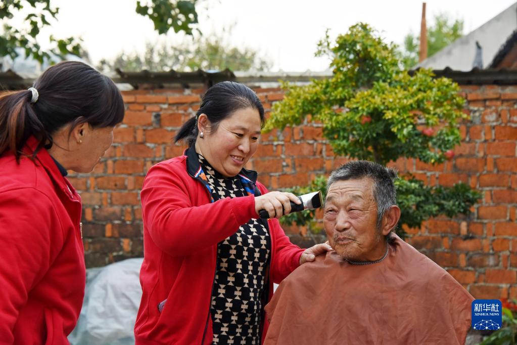 10月26日,在青島萊西市院上鎮北劉格莊村,工作人員上門(mén)為孤老張春順(右一)理發(fā)。