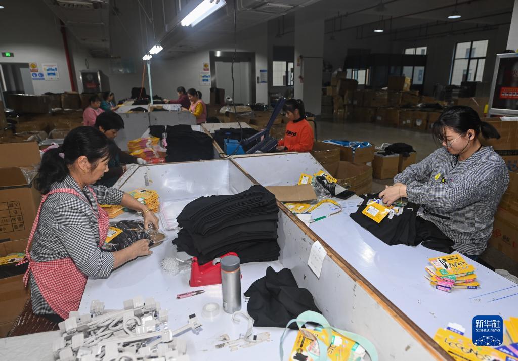10月27日,在浙江省諸暨市大唐街道的一家企業(yè)車(chē)間內,工人在包裝保暖褲襪。