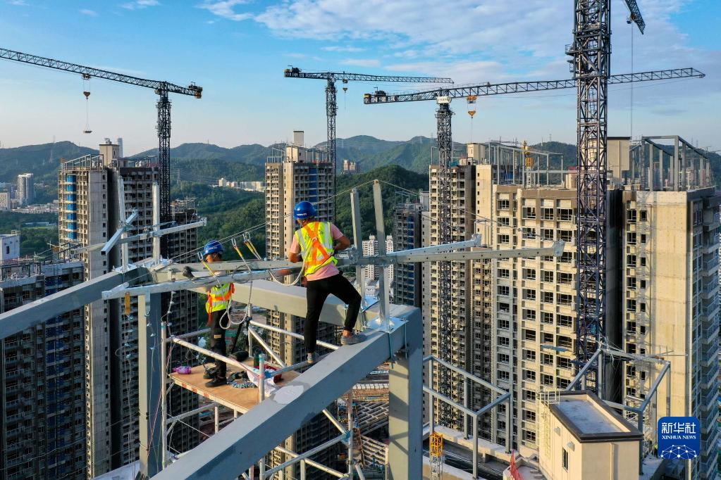 工人在華富村回遷安置房樓頂進(jìn)行幕墻裝配作業(yè)(10月20日攝,無(wú)人機照片)。