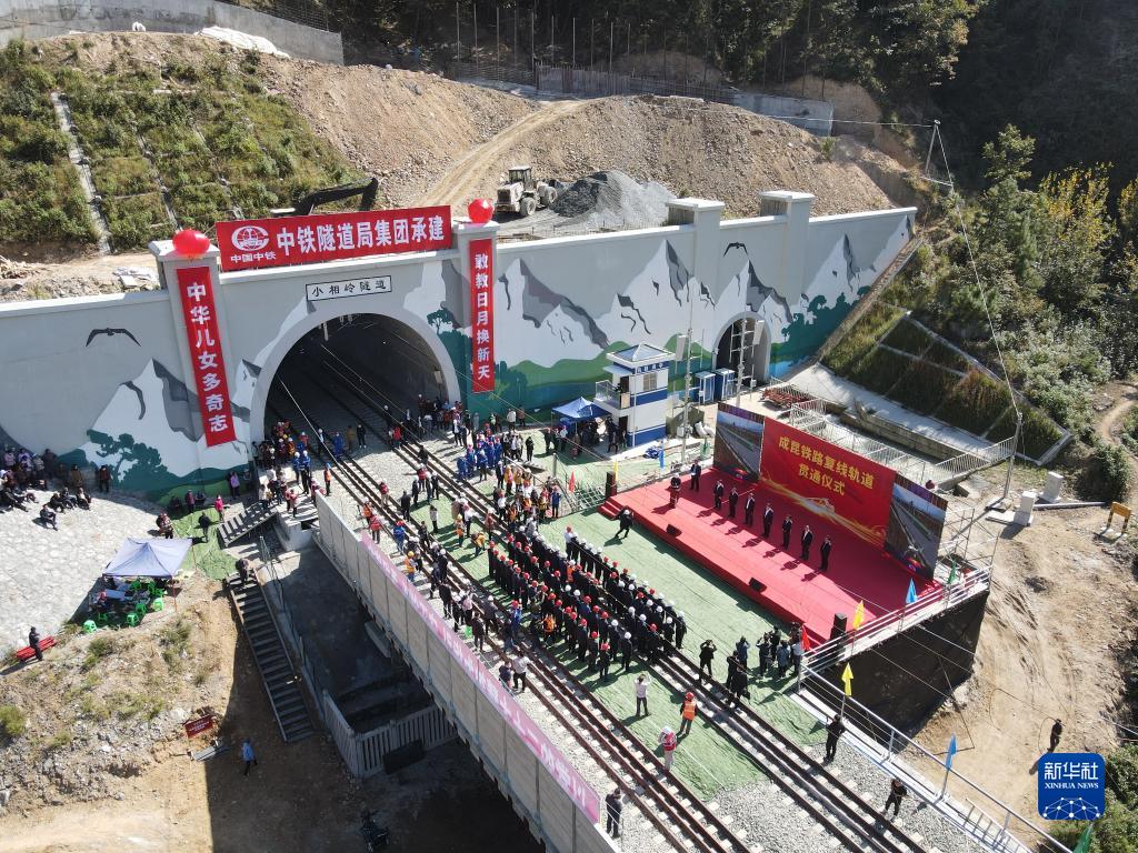 這是10月28日在四川省涼山彝族自治州喜德縣小相嶺隧道口拍攝的成昆鐵路復線(xiàn)軌道貫通儀式(無(wú)人機照片)。