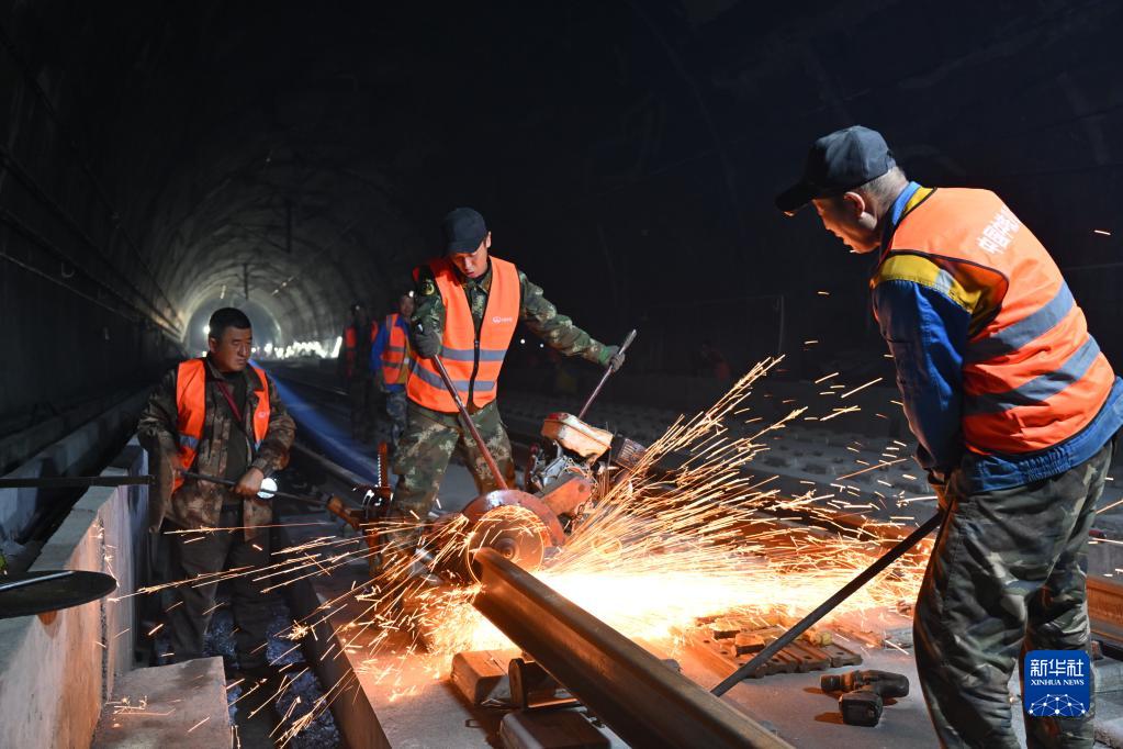 10月28日凌晨,在四川省涼山彝族自治州喜德縣小相嶺隧道內,施工人員進(jìn)行成昆鐵路復線(xiàn)鋪軌工作。