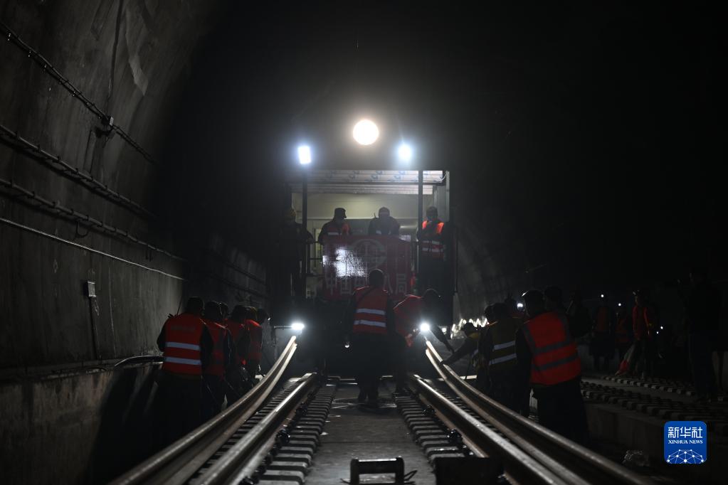 10月28日凌晨,在四川省涼山彝族自治州喜德縣小相嶺隧道內,施工人員進(jìn)行成昆鐵路復線(xiàn)鋪軌工作。