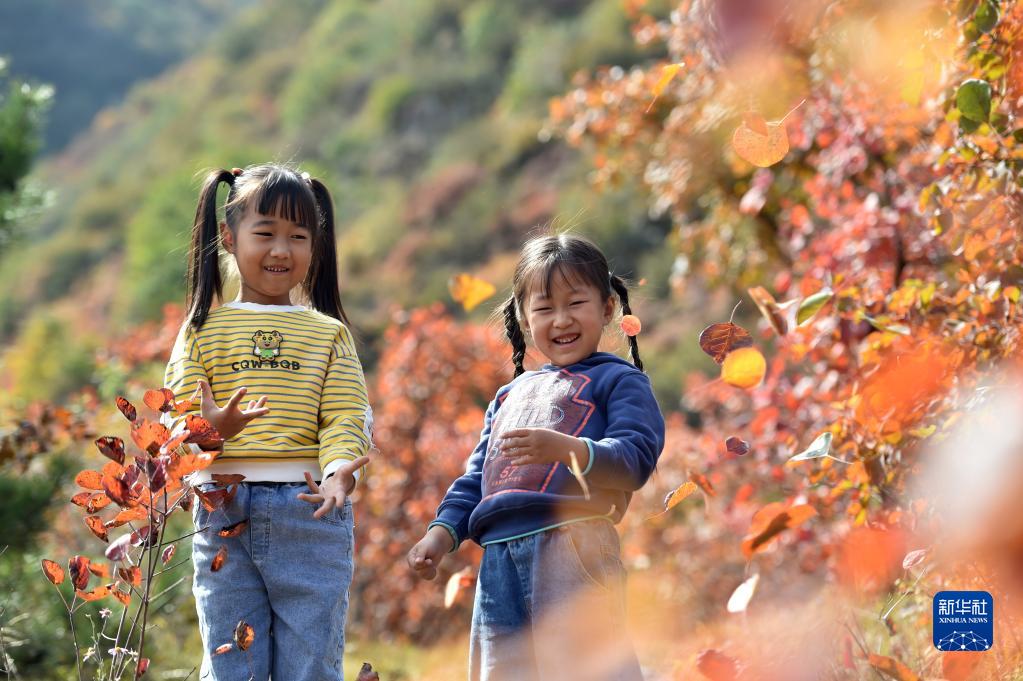 10月15日,在河北省石家莊市井陘縣仙臺山,小朋友在紅葉間玩耍。