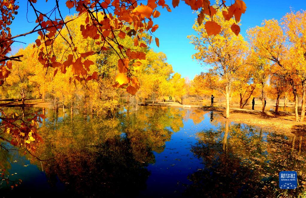 10月7日,游客在甘肅省金塔縣胡楊林景區拍照游玩。