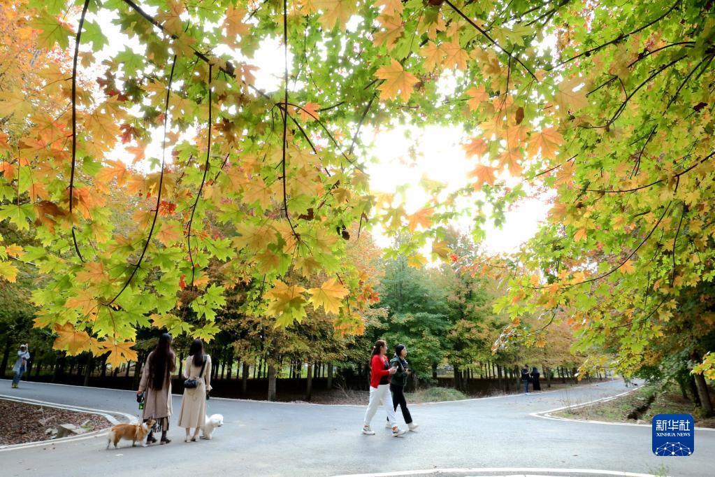 10月21日,游客在山東省青島市西海岸新區張家樓街道張家樓村楓樹(shù)林賞景游玩。