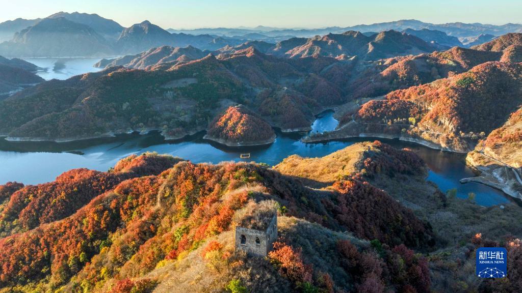 10月24日在河北省承德市與唐山市交界處的潘家口水庫拍攝的長(cháng)城秋景(無(wú)人機照片)。