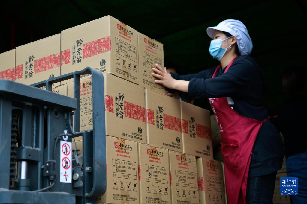 10月28日,在貴州省赤水市黔老翁醋廠(chǎng),工人搬運成品醋裝車(chē),準備外運銷(xiāo)售。