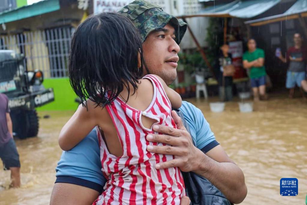 10月28日,在菲律賓馬京達瑙省帕朗,救援人員抱著(zhù)一名兒童從洪災區轉移。