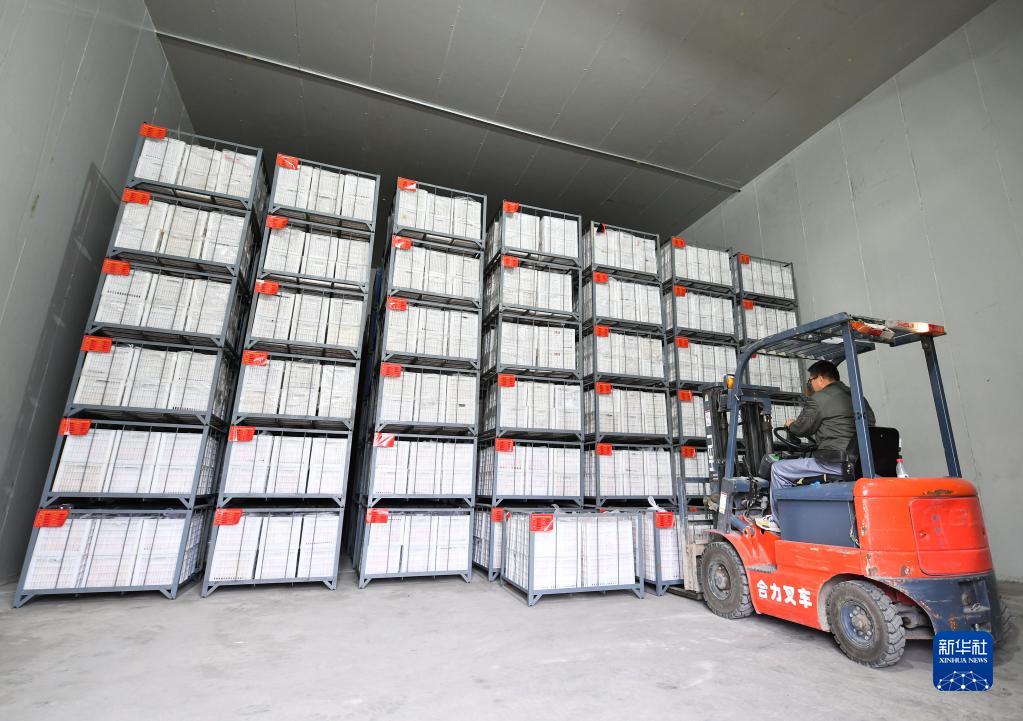 10月27日,在陜西省延安市安塞區南溝村,工作人員在冷庫搬運蘋(píng)果。 新華社記者 張博文 攝
