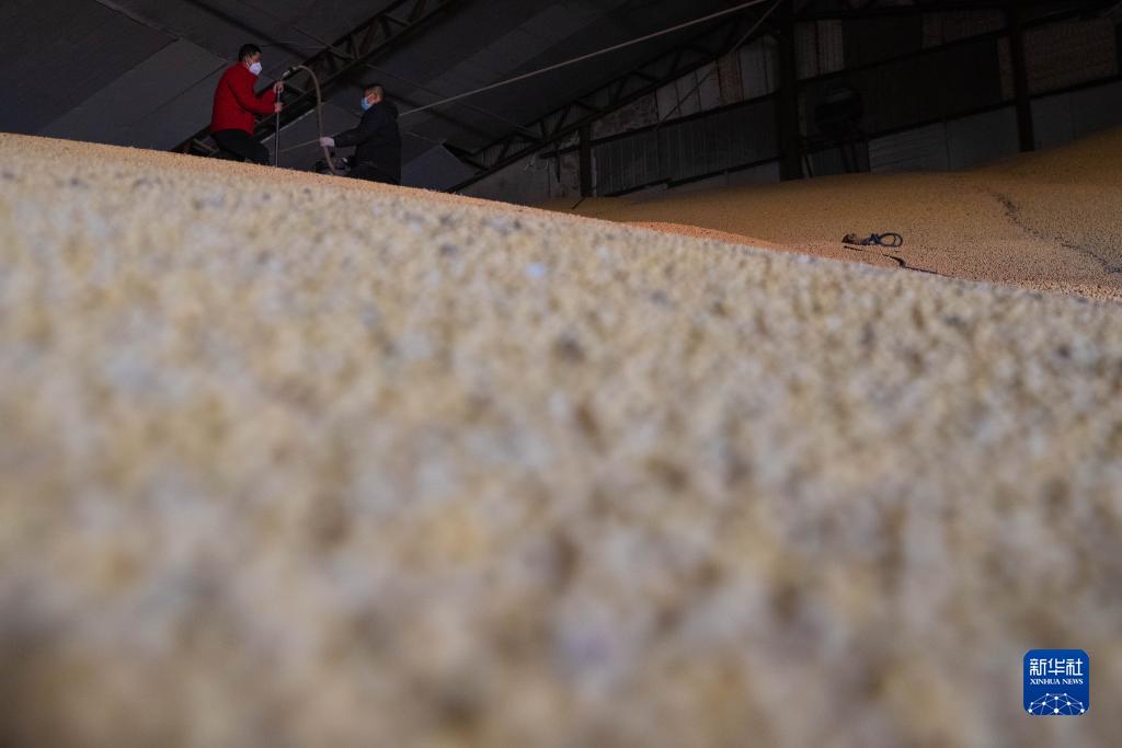 10月25日,在綏化市益盛糧食購銷(xiāo)有限公司內,工人進(jìn)行扦樣作業(yè),以此了解儲存倉內大豆水分、雜質(zhì)以及蟲(chóng)害等情況。