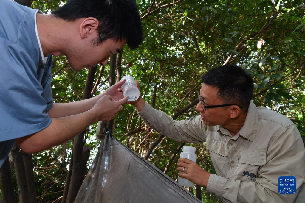 科研人員在廣州海珠濕地查看馬氏網(wǎng)采集到的昆蟲(chóng)樣本(2021年10月25日攝)。