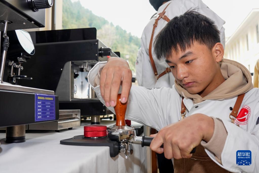 10月27日,重慶市黔江區民族職業(yè)教育中心的學(xué)生在實(shí)訓課上練習制作咖啡。