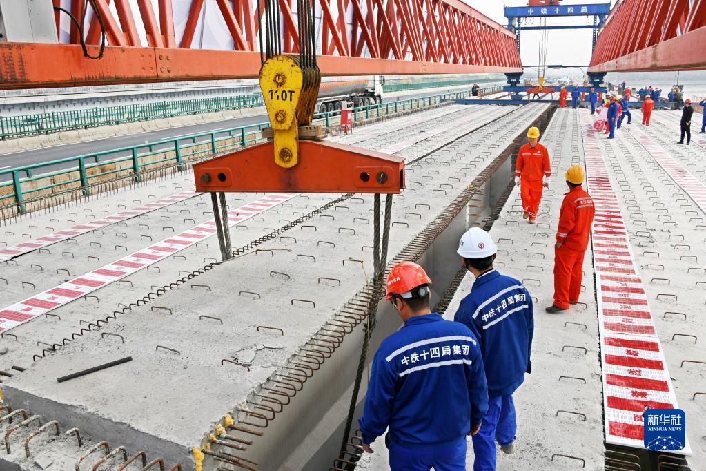 10月30日,青蘭高速公路雙埠至河套段女姑口特大橋施工現場(chǎng),中鐵十四局建設者在吊放最后一片50米T梁。
