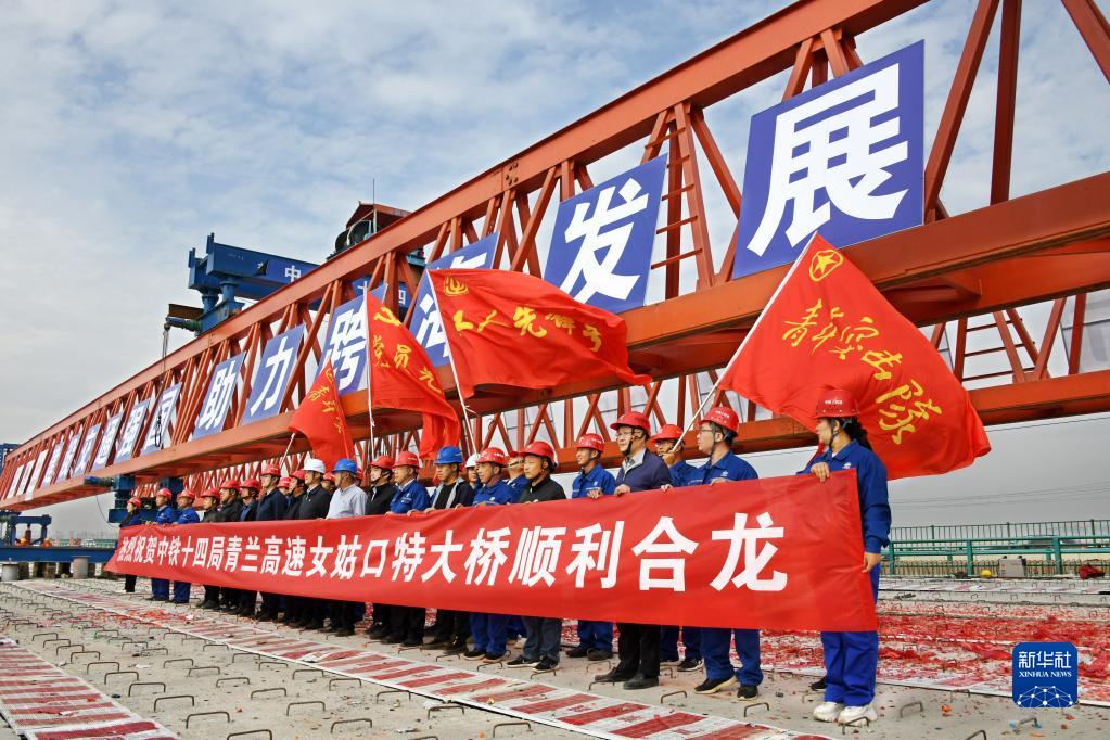 10月30日,中鐵十四局建設者在青蘭高速公路雙埠至河套段女姑口特大橋合龍現場(chǎng)慶祝。