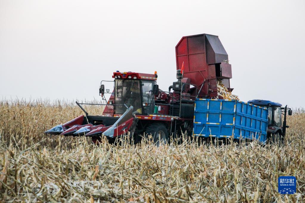 10月29日,在內蒙古通遼市科爾沁左翼中旗花吐古拉鎮三家子村的鹽堿化耕地改良試點(diǎn)示范區,農機手駕駛收割機收割玉米。