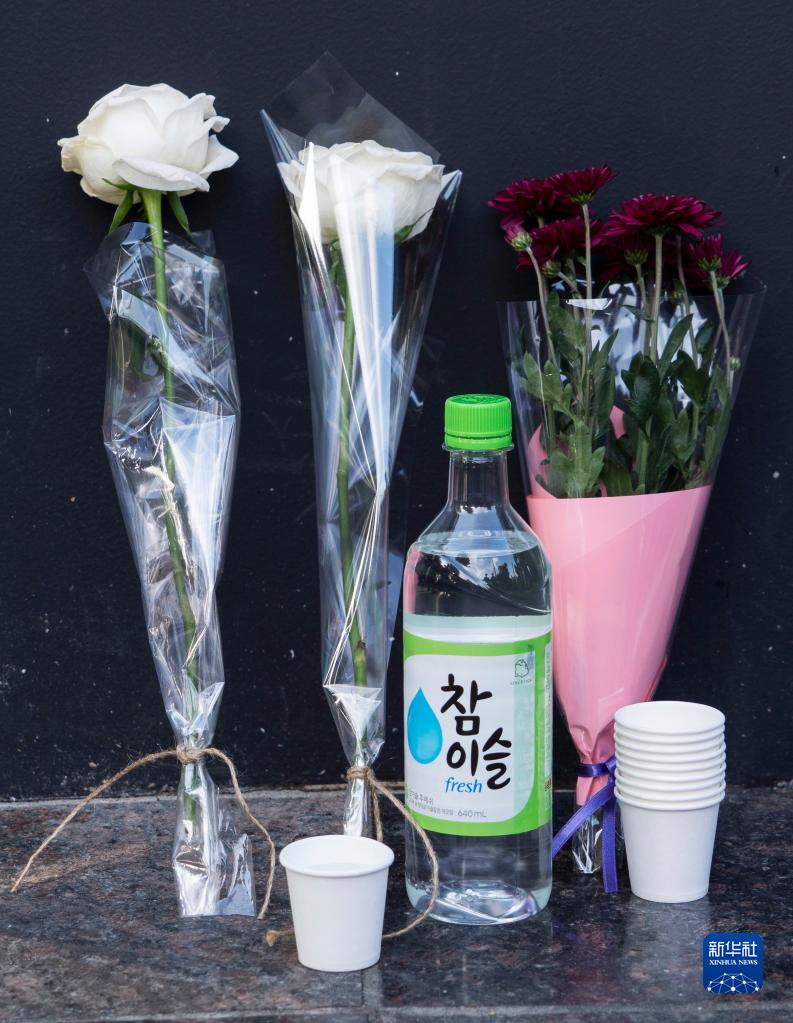 這是10月30日在韓國首爾踩踏事故現場(chǎng)附近拍攝的悼念遇難者的鮮花和酒。