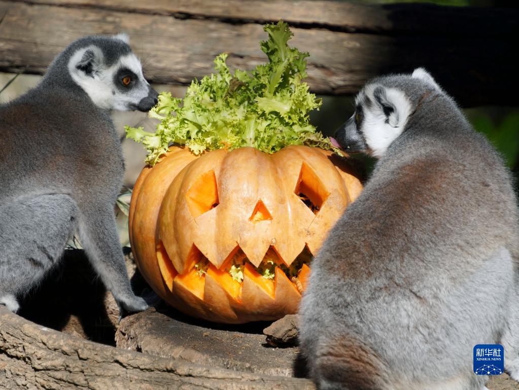 10月30日,在意大利羅馬動(dòng)物園,環(huán)尾狐猴享用節日南瓜。