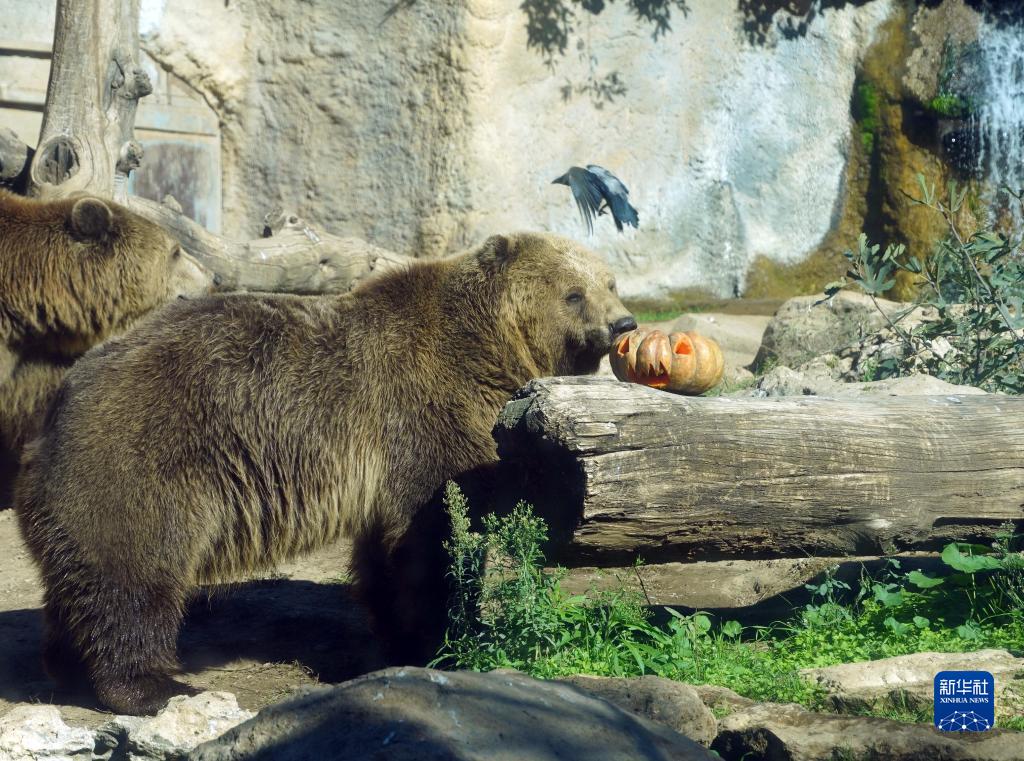 10月30日,在意大利羅馬動(dòng)物園,棕熊享用節日南瓜。