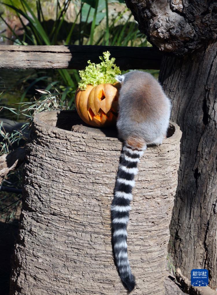 10月30日,在意大利羅馬動(dòng)物園,環(huán)尾狐猴享用節日南瓜。