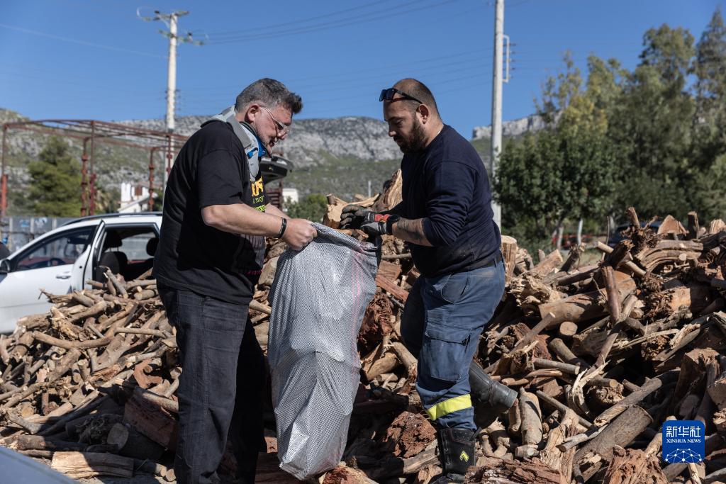 10月20日,在希臘首都雅典南郊的格利法達,工作人員(右)幫助居民拾取免費木柴。
