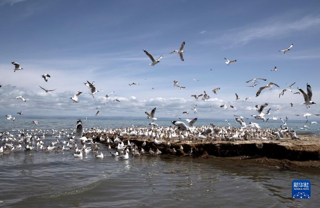 一群水鳥(niǎo)在青海湖鳥(niǎo)島濕地活動(dòng)(2021年7月1日攝)。