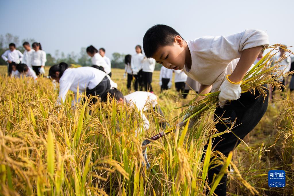 秋收時(shí)節,湖南省常德市桃源縣寺坪中學(xué)在農田開(kāi)展“田間課堂”活動(dòng),學(xué)生們體驗收割水稻、觀(guān)看農機作業(yè),學(xué)習糧食相關(guān)知識,感受勞動(dòng)的艱辛和豐收的喜悅。