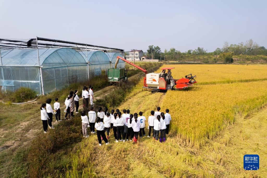 秋收時(shí)節,湖南省常德市桃源縣寺坪中學(xué)在農田開(kāi)展“田間課堂”活動(dòng),學(xué)生們體驗收割水稻、觀(guān)看農機作業(yè),學(xué)習糧食相關(guān)知識,感受勞動(dòng)的艱辛和豐收的喜悅。