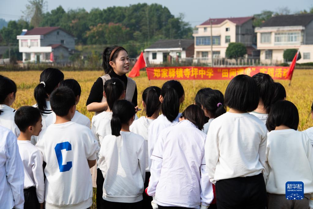 11月1日,在桃源縣鄭家驛鎮澄溪橋村稻田,老師為學(xué)生講解糧食相關(guān)知識。