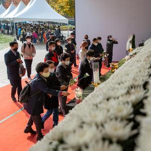 11月1日,民眾走進(jìn)設在韓國首爾廣場(chǎng)首爾圖書(shū)館正門(mén)前的集體焚香所,為遇難者獻花默哀。