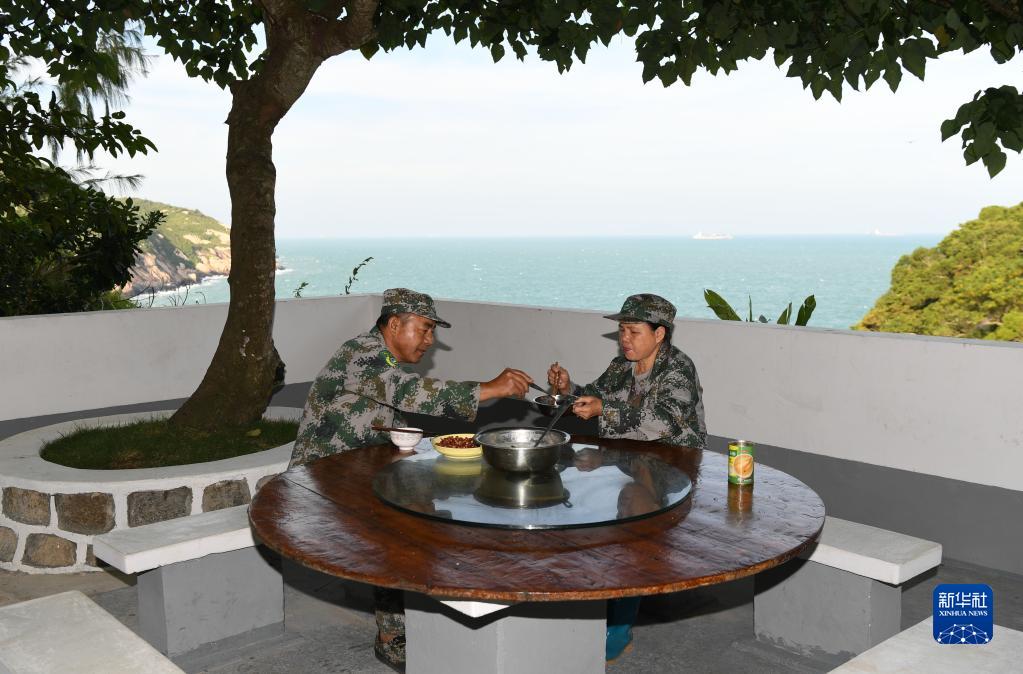 劉清偉和妻子潘紅在擔桿島的家里吃早飯(10月30日攝)。