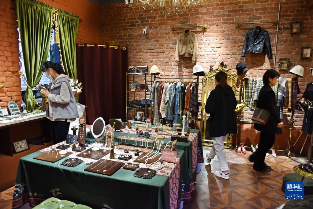11月1日,游客在青島市市南區銀魚(yú)巷一新開(kāi)的服飾店內選購。