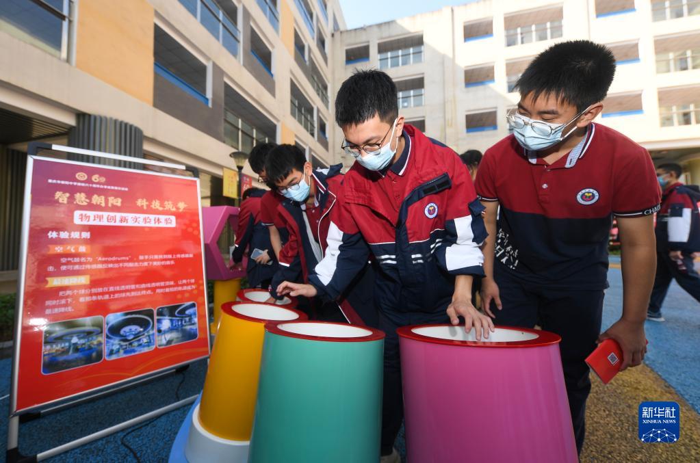 11月2日,重慶市朝陽(yáng)中學(xué)學(xué)生在活動(dòng)現場(chǎng)體驗空氣鼓。