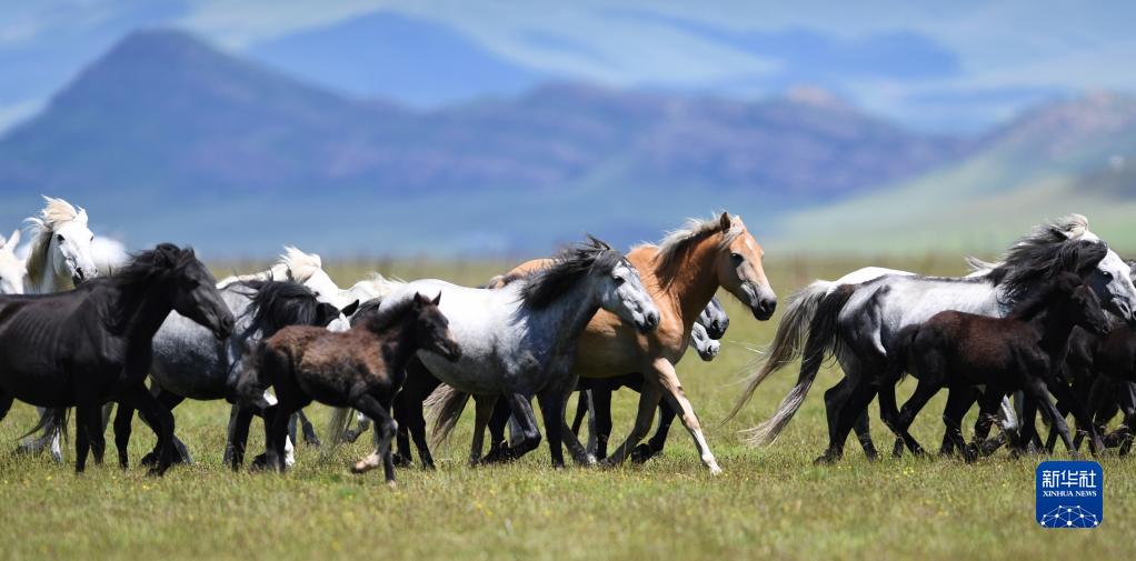 這是在甘肅省甘南藏族自治州瑪曲縣河曲馬場(chǎng)的濕地拍攝的河曲馬(2021年7月15日攝)。