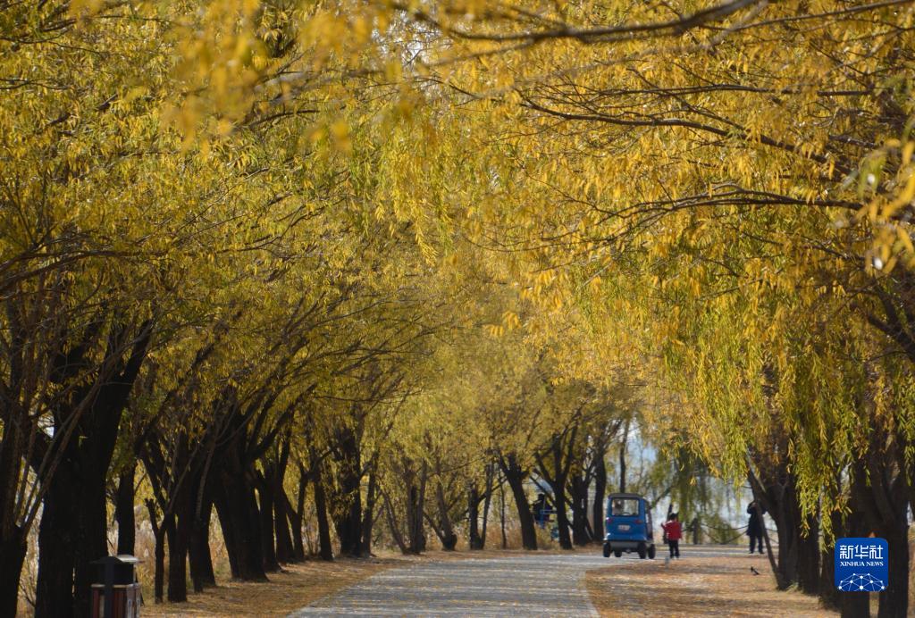 游人在北京野鴨湖國家濕地公園內賞秋(11月1日攝)。