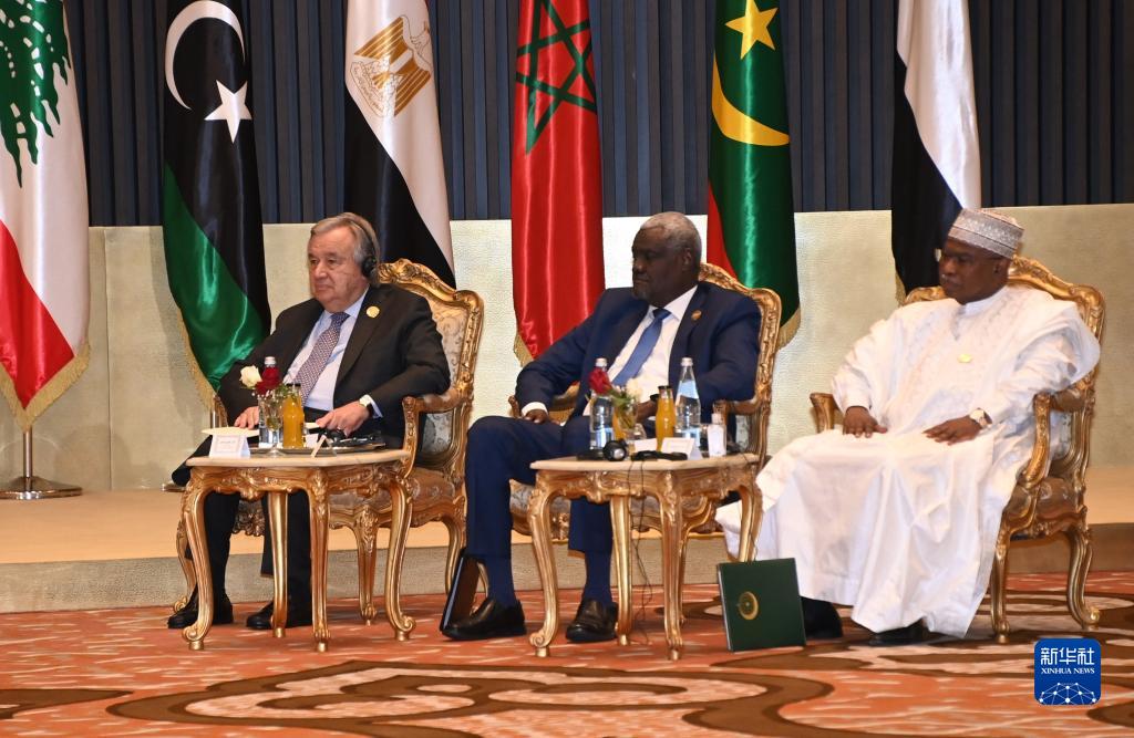 11月1日,聯(lián)合國秘書(shū)長(cháng)古特雷斯(左)等在阿爾及利亞首都阿爾及爾出席第31屆阿拉伯國家聯(lián)盟首腦理事會(huì )會(huì )議。