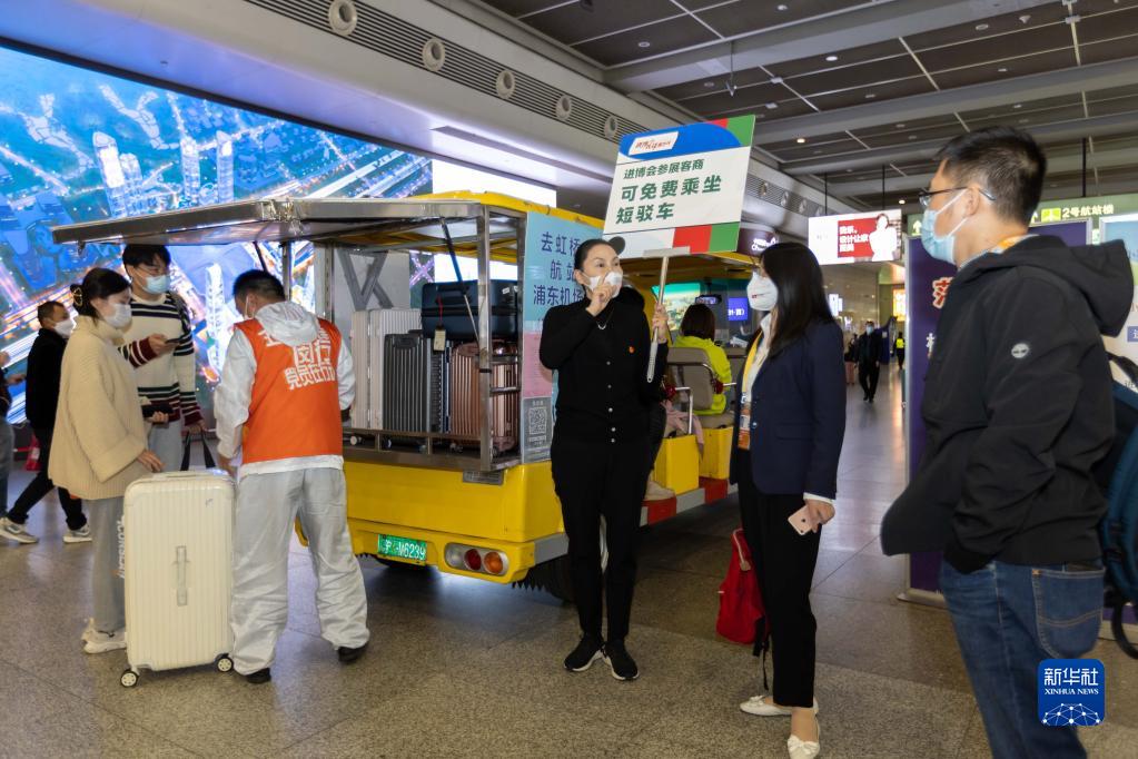 11月2日,上海虹橋火車(chē)站出站口,工作人員向參加進(jìn)博會(huì )的持證旅客介紹進(jìn)博直通車(chē)。
