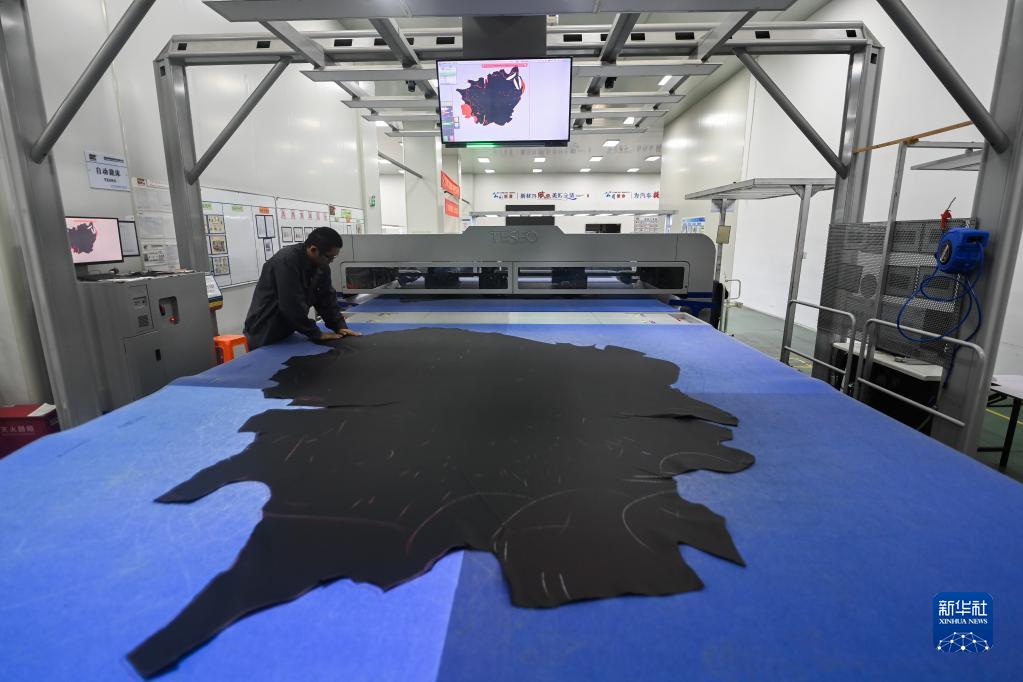11月2日,在嘉興南湖區的明新旭騰新材料股份有限公司的牛皮汽車(chē)革數字化車(chē)間內,自動(dòng)化裁床準備從一整塊皮料上裁剪出不同形狀的車(chē)用皮料。