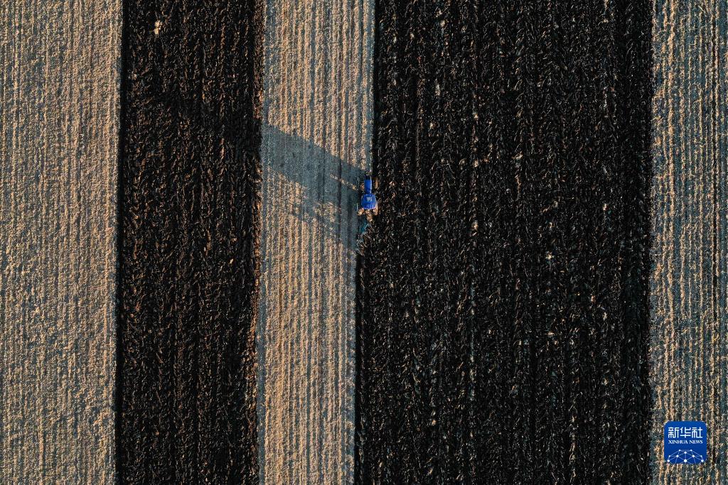 在吉林省公主嶺市環(huán)嶺街道土城子村,農民駕駛拖拉機對已收獲的耕地進(jìn)行秸稈深翻還田保護性作業(yè)(無(wú)人機照片,11月1日攝)。