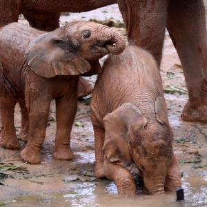 11月3日,新生非洲象寶寶在媽媽陪伴下玩耍。