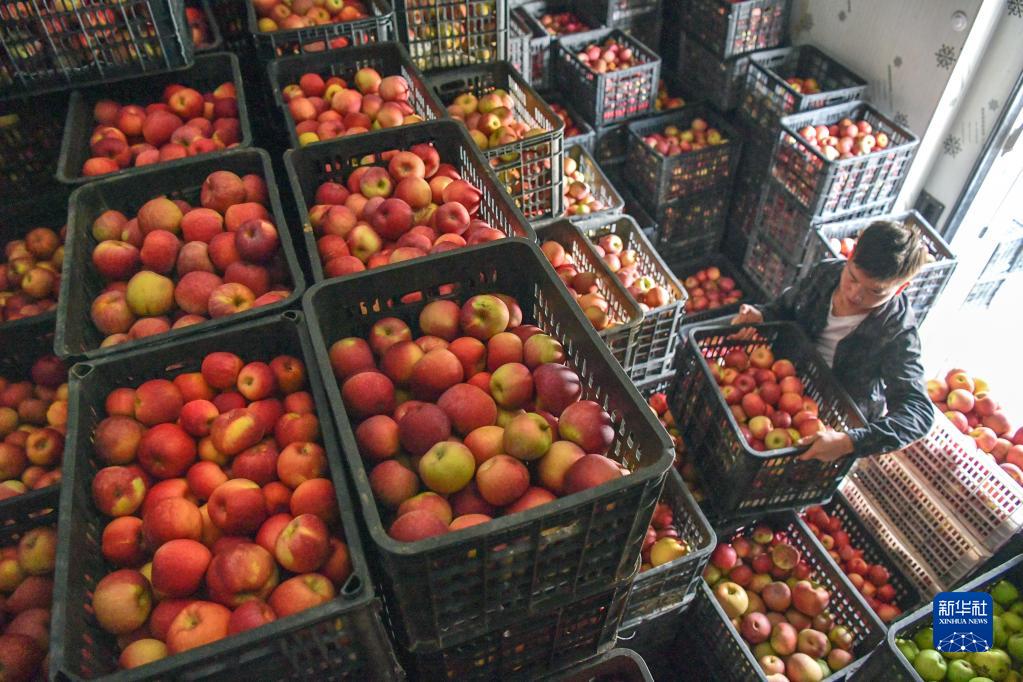 11月3日,果農在貴州省威寧縣中水鎮一保鮮冷庫里搬運蘋(píng)果。