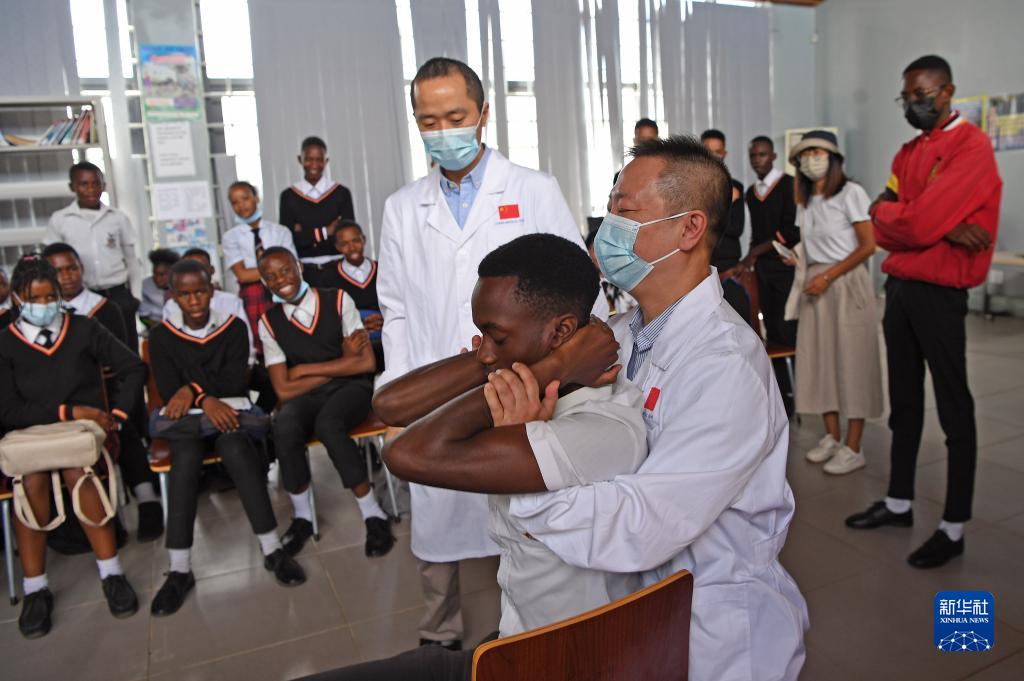 11月3日,在納米比亞首都溫得和克的毛澤東主席中學(xué),中國援納醫療隊醫生為學(xué)生演示中醫推拿。