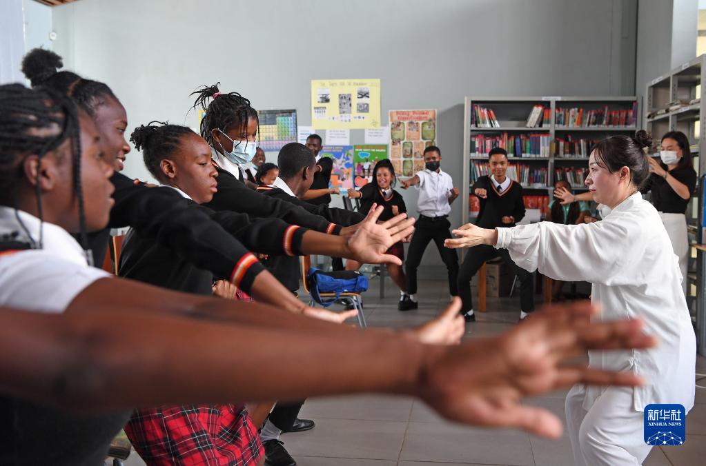 11月3日,在納米比亞首都溫得和克的毛澤東主席中學(xué),學(xué)生在中國援納醫療隊醫生的帶領(lǐng)下學(xué)習八段錦。